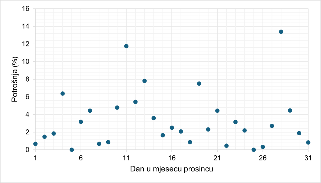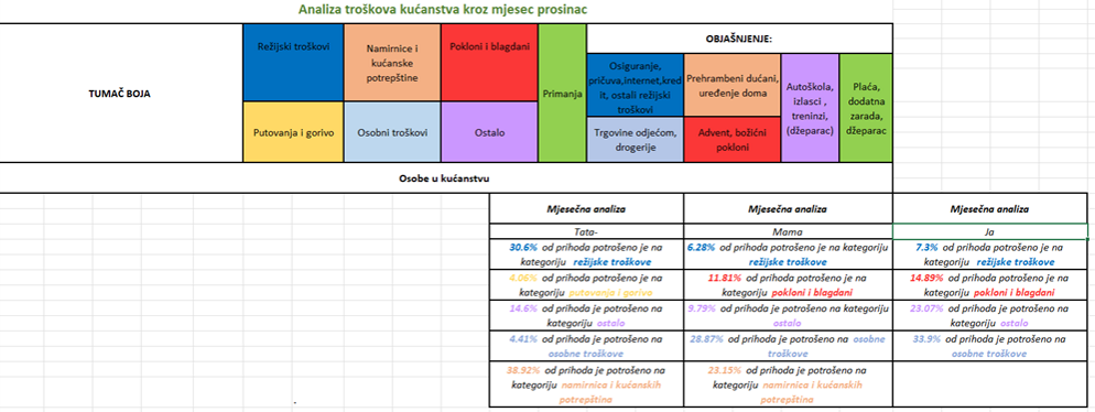 Tijekom mjeseca prosinca napravite analizu troškova svojeg kućanstva. U suradnji sa svojim roditeljima pratite plaćanje režija, rate kredita, kupovanje namirnica i planiranje obroka, kupovanje poklona za blagdane, troškove prijevoza, putovanja te izleta i svega što utječe na kućni budžet. Detaljnu analizu potrebno je predočiti u Excel tablici. Molim vas da ne otkrivate privatne novčane podatke, već primijenite postotke, npr. mjesečno se troši 40 % budžeta na namirnice. Razgovarajte sa svojim roditeljima kako dijele financije, imaju li fond za crne dane i općenito kako organiziraju sve svoje troškove.