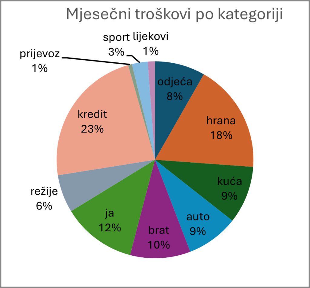 Tijekom ovog projektnog zadatka naučio sam puno novih stvari! Većina informacija nije me iznenadila, najviše su me iznenadili moji troškovi jer sam mislio da su manji te kućanski trošak na hranu. Ovaj projektni zadatak jako mi se svidio te mislim da je nam je potreban jer smo većinski svi punoljetni i ovo nam je zadnja godina srednjoškolskog obrazovanja, a ove informacije bitne su nam za budućnost.