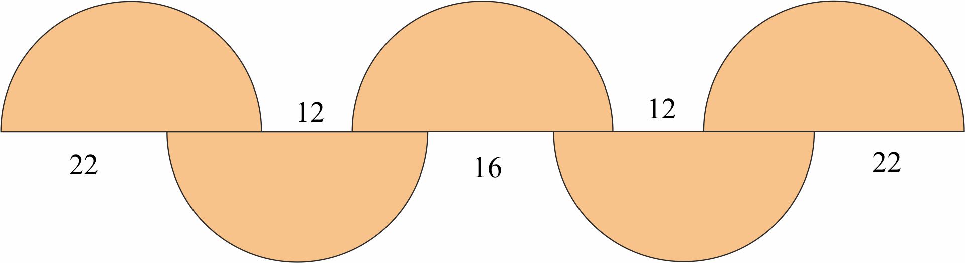 S obzirom na to da su svi polukrugovi identični, označimo s $x$ promjer jednog od njih. Zatim, gornji i donji dio slike promatramo kao dvije strane jednadžbe jer su istih duljina. Tada dobivamo: $$x + 12 + x + 12+x = 22 + x + 16 + x + 22.$$ Nakon pojednostavnjivanja dobivamo: $$\begin{align}3x + 24 &= 2x + 60\\ x + 24 &= 60.\end{align}$$ Dobiveni promjer: $$x=36\text{ jediničnih dužina.}$$