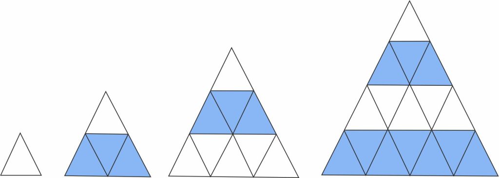 Ako pažljivo pogledamo, na vrhu svih formacija nalazi se jedan bijeli trokut, nakon toga primjećujemo $3$ plava trokuta, zatim $5$ bijelih trokuta i tako dalje. To znači da svaki sljedeći redak ima $2$ trokuta više od onog iznad njega. To je naš prvi uzorak.