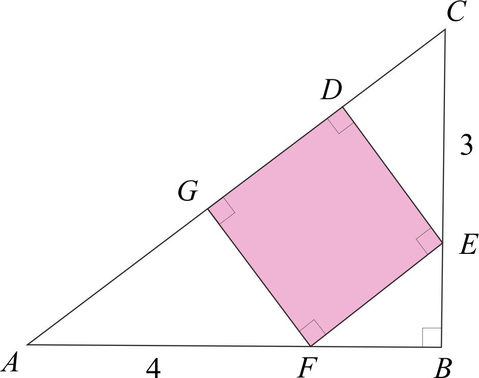 Odredimo površinu kvadrata $DEFG$ upisanog u pravokutni trokut $ABC$ (vidi sliku).