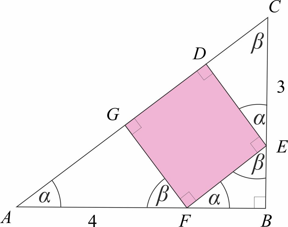 Istaknimo na slici $\alpha$, pravi kut i $\beta$. Promotrimo trokut $AFG$. Kako je pravi kut pri vrhu $G$, onda je očito da je $\beta$ pri vrhu $F$. Sada promotrimo trokut $CDE$. Kako je pravi kut pri vrhu $D$, onda je očito da je $\alpha$ pri vrhu $E$. Konačno, pri vrhu $F$ imamo već označene kutove $\beta$ i pravi kut, pa je stoga u desnom trokutu kut pri vrhu $F$ jednak $\alpha$. Kako je u trokutu $FBE$ pravi kut pri vrhu $B$, onda je $\beta$ kut pri vrhu $E$.