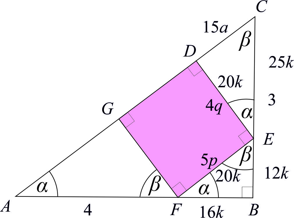 Vratimo se na trokut $FBE$. Budući da je $p=4k$, a $|FB|=4p$ slijedi $|FB|=16k$, a iz $|BE|=3p$ slijedi $|BE|=12k$.