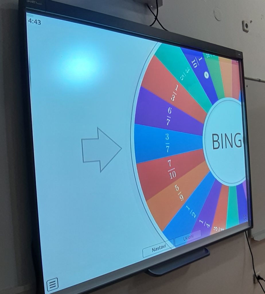 Za učenike pripremimo bingo kartice sa slikovnim zapisom razlomka (izvor: https://worksheets.site/fractions-bingo.html ). Na pametnom ekranu projiciramo kolo sreće i izvlačimo brojeve, tj. brojčani zapis razlomka koji učenici trebaju povezati sa slikovnim zapisom na svojoj kartici. Učitelj upisuje izvučene brojeve na svoju kontrolnu listu. Prvi učenik koji zaokruži (prekriži) 5 rješenja u nizu (vodoravno, okomito ili dijagonalno) uzvikuje: “Bingo!” Na kartici ovaj put imamo u sredini jedno slobodno polje koje mijenja broj. Nakon provjere rješenja simbolično nagradimo učenika.