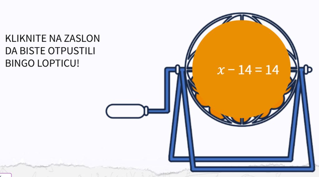 Iz virtualnog bubnja izvlačimo kuglice sa zadatcima. Nakon što učenici riješe linearnu jednadžbu s jednom nepoznanicom, provjeravaju je li rješenje na njihovoj bingo kartici.