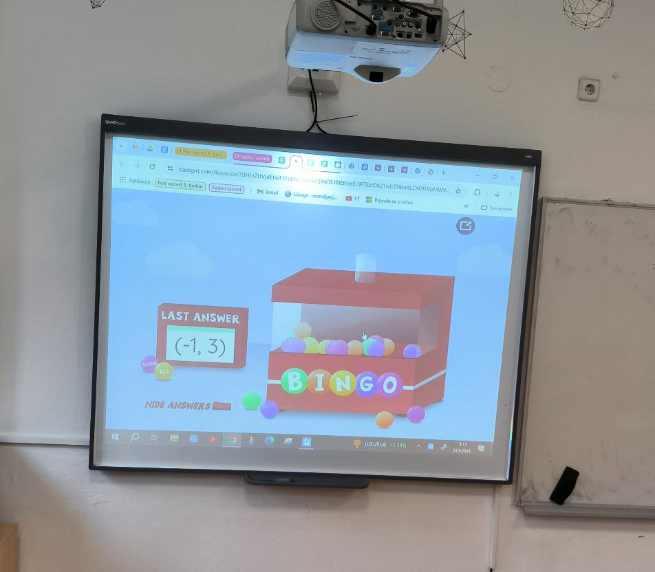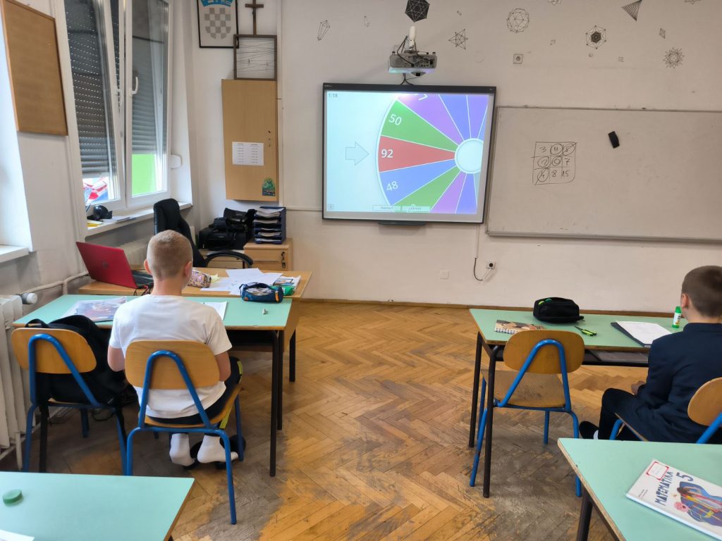 Nakon što učenici riješe sve zadatke, biraju svojih 9 rješenja i upisuju ih u prvu tablicu. Ako se učenici nikada nisu susreli s igrom bingo, važno je objasniti pravila kako bi svima bila jasna. Na pametnom ekranu projiciramo kolo sreće i izvlačimo brojeve. Učitelj treba izvučene brojeve upisati na svoju kontrolnu listu.