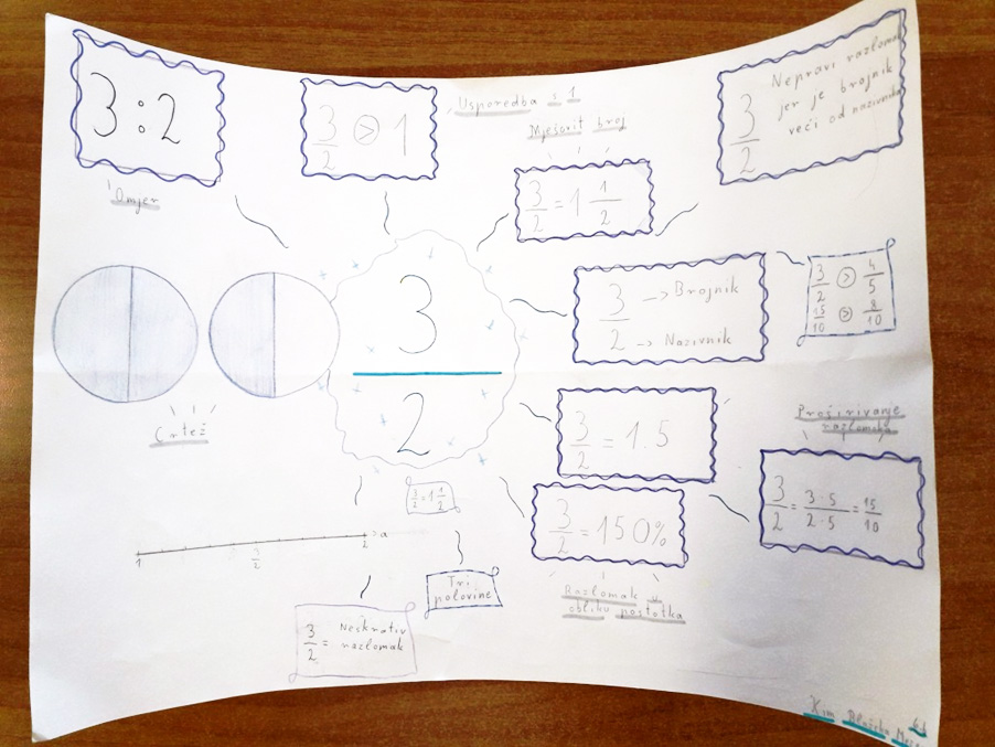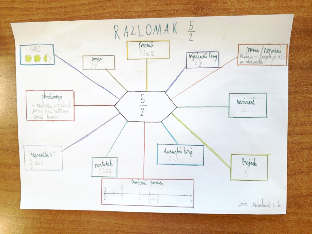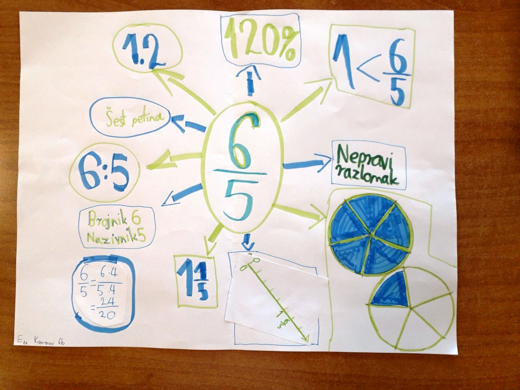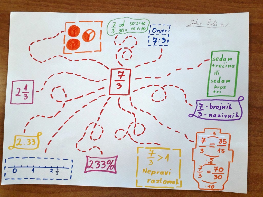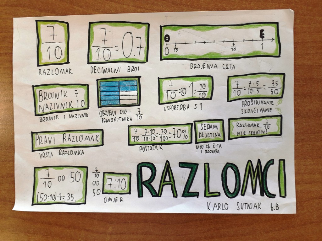 Završivši cjelinu Djeljivost i razlomci u šestom razredu, započeli smo s cjelinom Računanje s razlomcima. Učenici su za zadatak dobili izraditi plakat na način da je svaki učenik dobio svoj razlomak te je o tom razlomku trebao ispuniti 12 okvira. Svaki je učenik dobio različiti razlomak kako bismo osigurali raznolikost zadataka, potaknuli originalnost i kreativnost te omogućili cjelovitiji uvid u različite zapise i oblike razlomaka. Učenici su pogledali uspješne plakate iz prethodne generacije, odnosno dva plakata koja su u nastavku.
