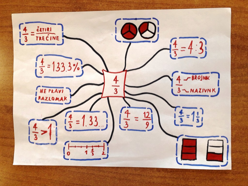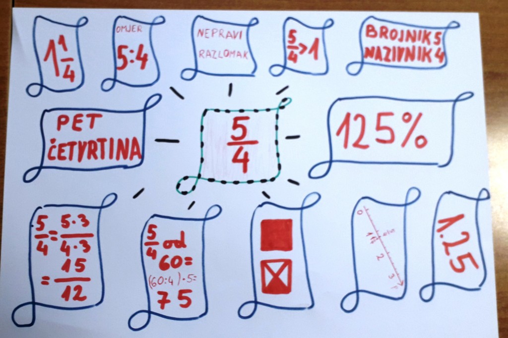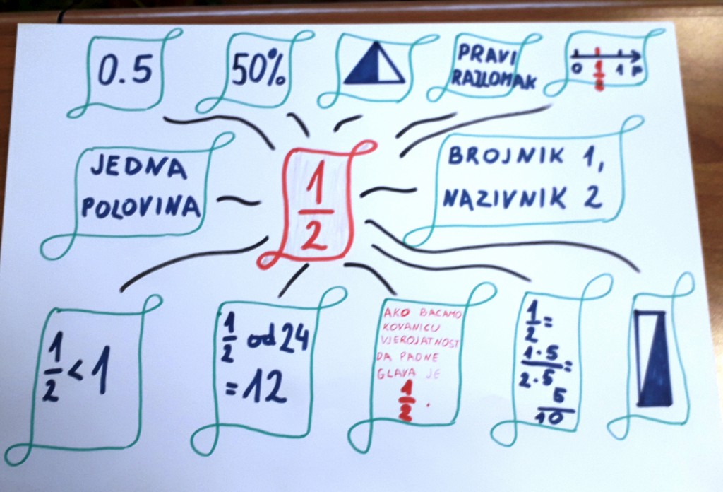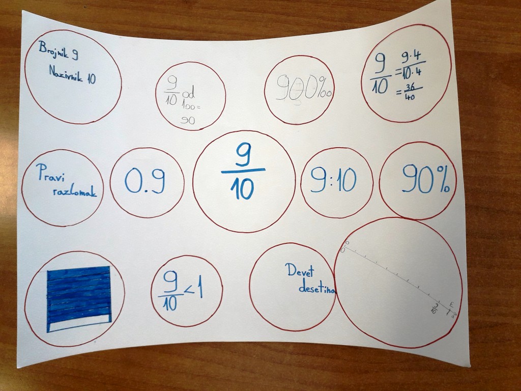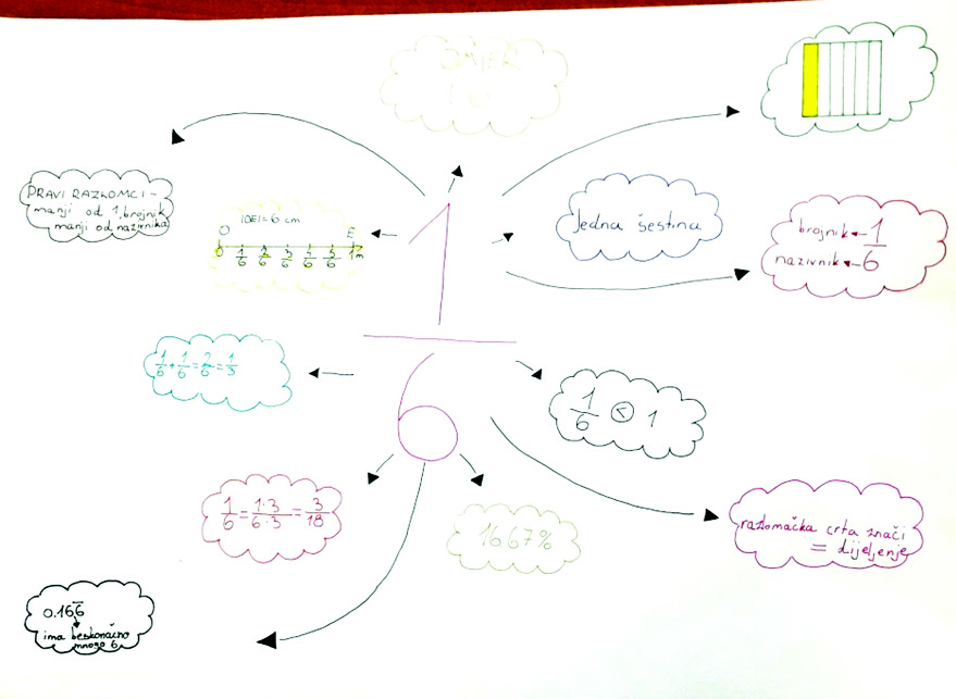 Završivši cjelinu Djeljivost i razlomci u šestom razredu, započeli smo s cjelinom Računanje s razlomcima. Učenici su za zadatak dobili izraditi plakat na način da je svaki učenik dobio svoj razlomak te je o tom razlomku trebao ispuniti 12 okvira. Svaki je učenik dobio različiti razlomak kako bismo osigurali raznolikost zadataka, potaknuli originalnost i kreativnost te omogućili cjelovitiji uvid u različite zapise i oblike razlomaka. Učenici su pogledali uspješne plakate iz prethodne generacije, odnosno dva plakata koja su u nastavku.