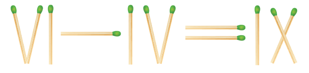 Zagonetka 1 [4]. Zadana je jednakost koju čini 12 šibica. Jednakost pokazuje: $6-4=9$. Pomakni samo jednu šibicu kako bi dobio istinitu jednakost.