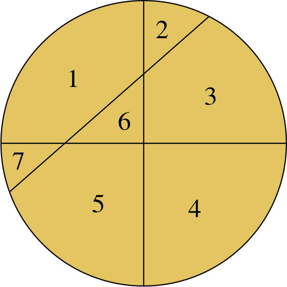 Jednim ravnim rezom pitu možete prerezati na dva komada. Drugi rez, koji siječe prvi, daje četiri komada, a treći rez kao na slici, može dati čak sedam komada. Koliki je najveći broj komada koji se može dobiti sa šest ravnih rezova?