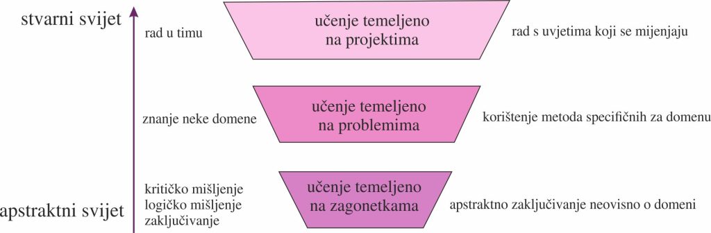 Model prikazan na slici pozicionira učenje temeljeno na zagonetkama na najapstraktnijem dijelu kontinuuma između apstraktnog i stvarnog svijeta, gdje učenici bez pritiska stvarnih posljedica razvijaju strategije rješavanja problema [5]. Učenje temeljeno na problemima nadovezuje se na to primjenom strategija u specifičnim domenama, a projektno učenje vodi do rješavanja stvarnih, složenih izazova. Time učenje temeljeno na zagonetkama čini prvu stepenicu u izgradnji matematičke pismenosti i sposobnosti kritičkog razmišljanja.