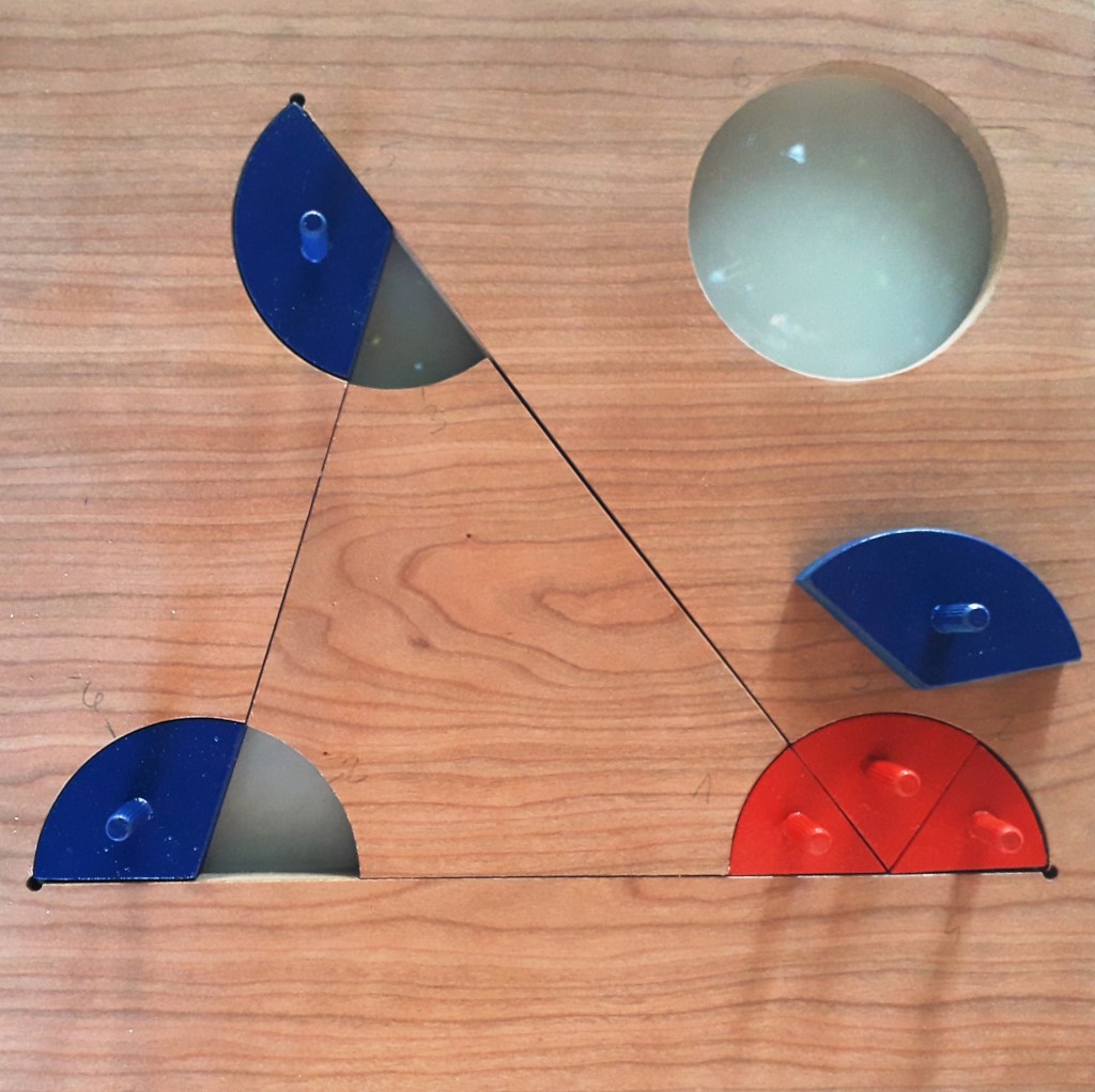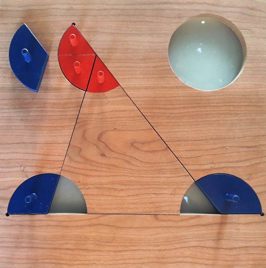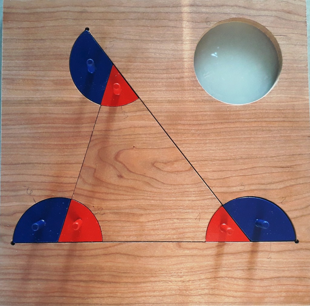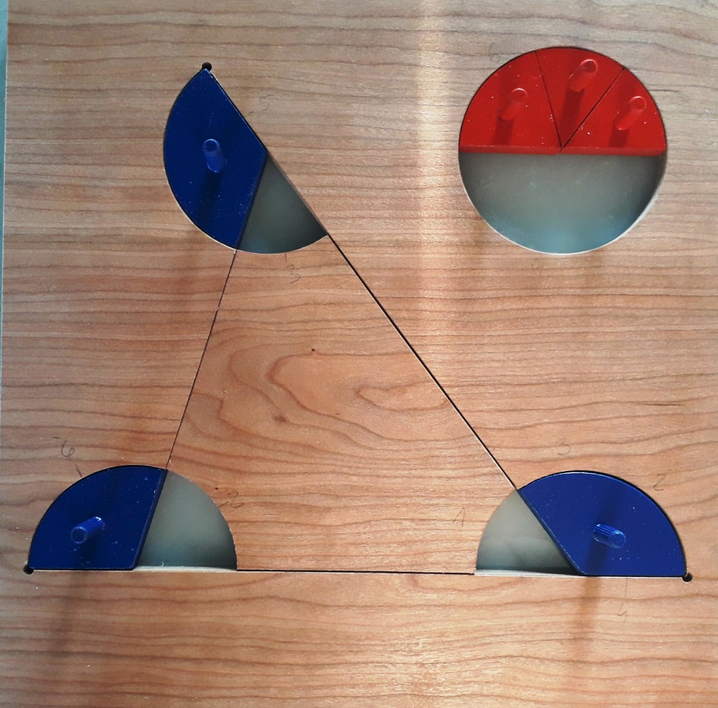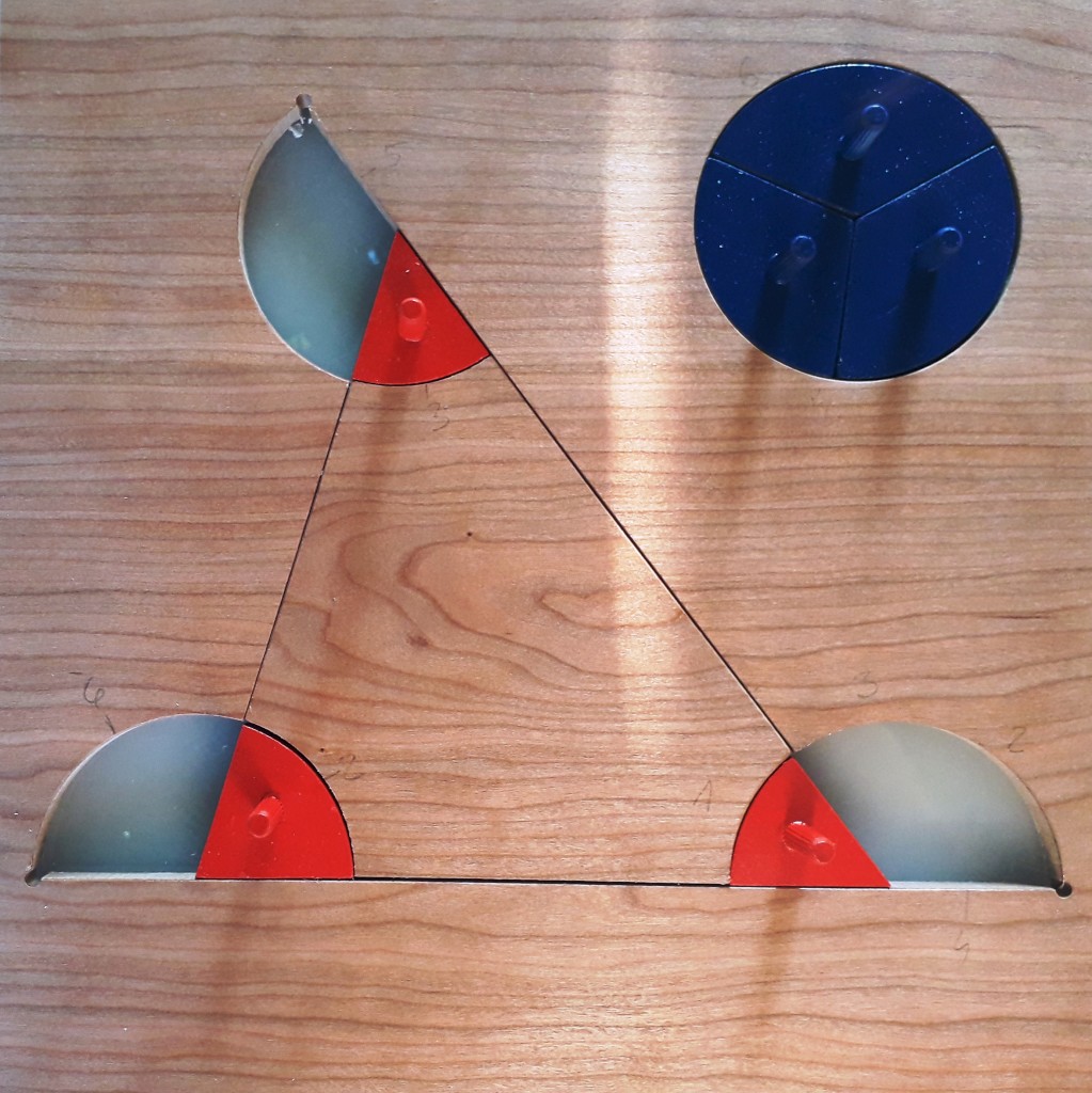 Na modelu drvenog trokuta unutarnji kutovi obojeni su crvenom bojom, a vanjski kutovi plavom bojom. Uz trokut još je posebno s desne strane izrezan krug jednakog polumjera kao kružni isječci koji nam predstavljaju kutove/praznine u koje možemo stavljati crvene i plave modele kutova.
